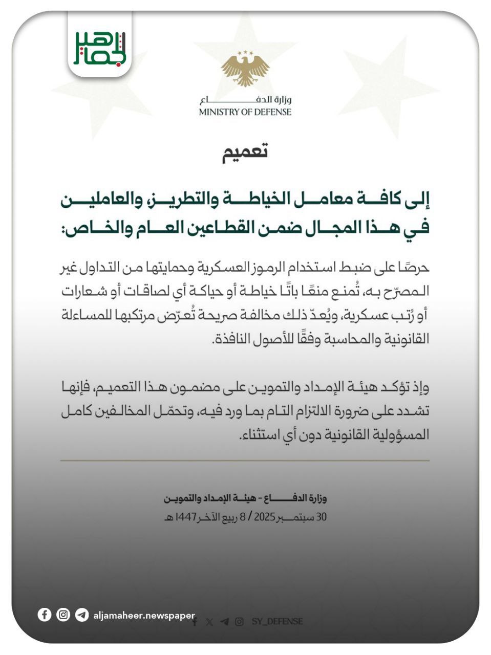 تعميم من وزارة الدفاع إلى كافة معامل الخياطة والتطريز والعاملين في هذا المجال بمنع خياطة أو حياكة أي لصاقات أو شعارات أو رتب عسكرية، ويعد ذلك مخالفة صريحة تعرض مرتكبيها للمساءلة القانونية محليات On سبتمبر 30, 2025 Share Share FacebookTwitterGoogle+ReddItWhatsAppPinterestالبريد الإلكتروني
