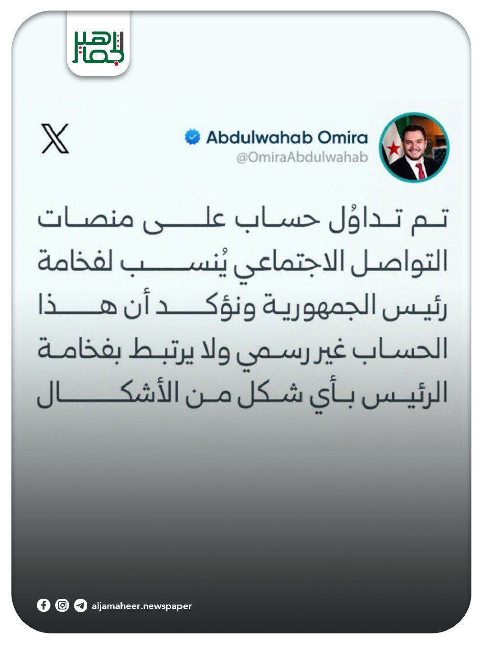 📌كما نُشير إلى أن الحسابات الرسمية الوحيدة المعتمدة تصدر عن رئاسة الجمهورية العربية السورية وأي حسابات أخرى ومنها الحساب المشار إليه: