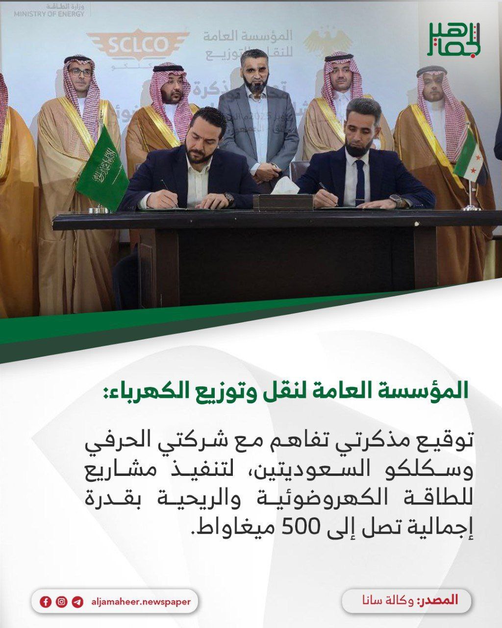 مراسل سانا: المؤسسة العامة لنقل وتوزيع الكهرباء توقع مذكرتي تفاهم مع شركتي الحرفي وسكلكو السعوديتين، لتنفيذ مشاريع للطاقة الكهروضوئية والريحية بقدرة إجمالية تصل إلى 500 ميغاواط. محليات On أكتوبر 1, 2025 Share #صحيفة_الجماهير Share FacebookTwitterGoogle+ReddItWhatsAppPinterestالبريد الإلكتروني