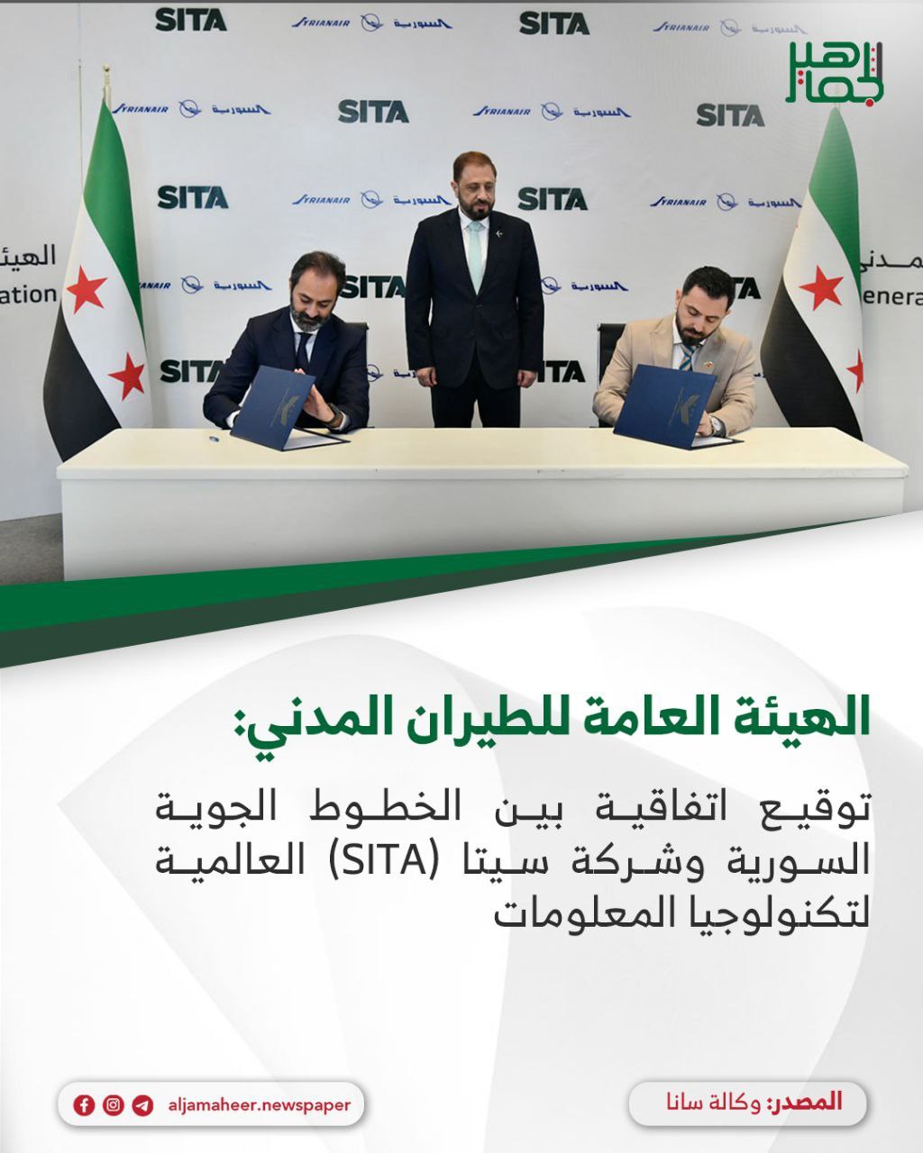 مراسلة سانا: توقيع اتفاقية بين الخطوط الجوية السورية وشركة سيتا (SITA) العالمية لتكنولوجيا المعلومات لتحسين خدمات الاتصالات والبرمجيات في الناقل الوطني السوري، وذلك في مبنى الهيئة العامة للطيران المدني والنقل الجوي بدمشق. منوعات On أكتوبر 2, 2025 Share #صحيفة_الجماهير Share FacebookTwitterGoogle+ReddItWhatsAppPinterestالبريد الإلكتروني
