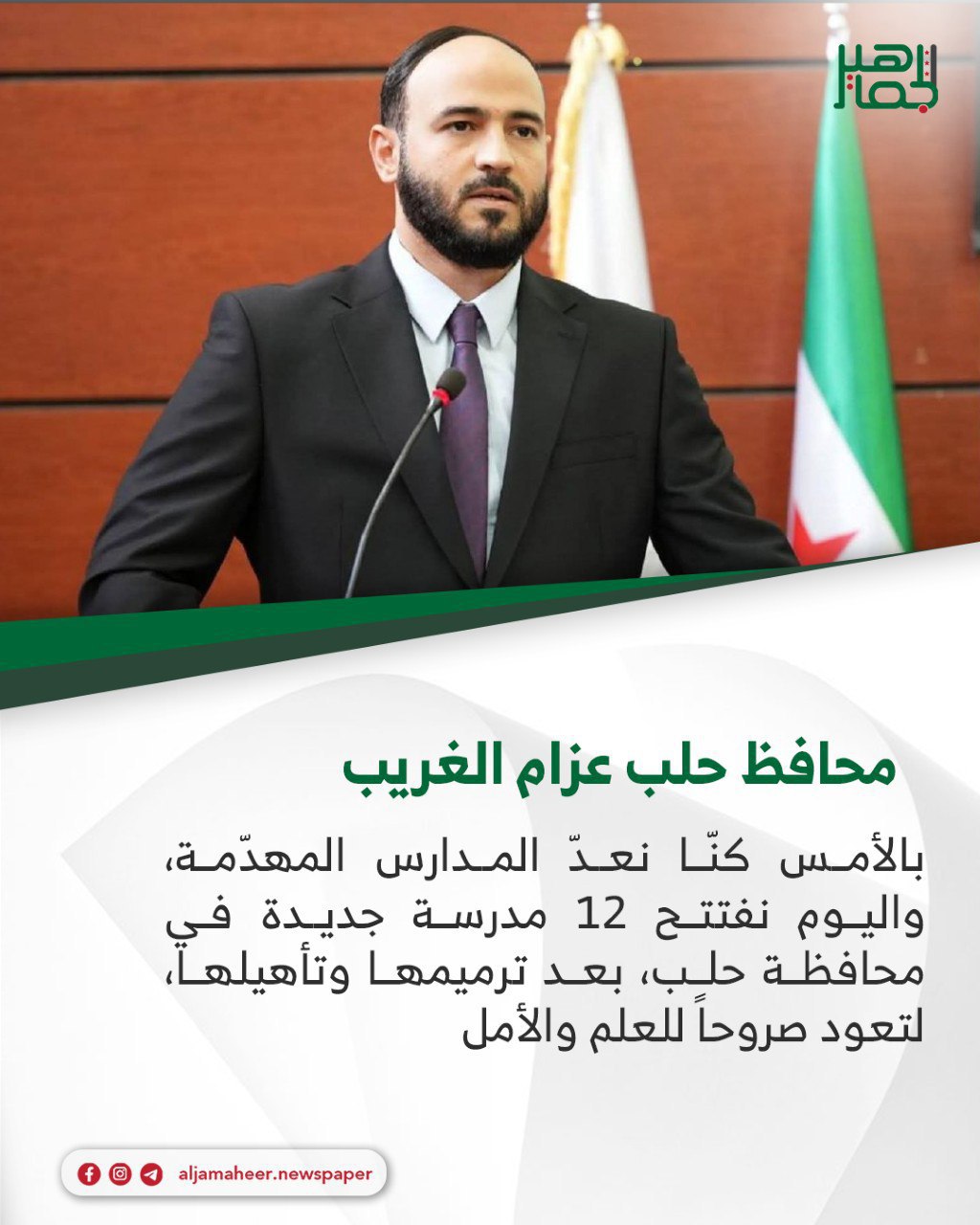 📌بالأمس كنّا نعدّ المدارس المهدّمة، واليوم نفتتح 12 مدرسة جديدة في محافظة حلب، بعد ترميمها وتأهيلها، لتعود صروحاً للعلم والأمل.