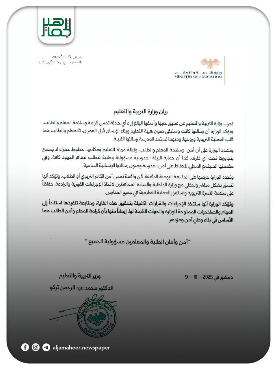 بيان وزارة التربية والتعليم: شباب وجامعات On أكتوبر 9, 2025 Share تشدد الوزارة على أن أمن وأمان الطلبة والمعلمين ونبالة مهنة التعليم ومكانتها خطوط حمراء لا يُسمح بتجاوزها وهي مسؤولية الجميع. #صحيفة_الجماهير Share FacebookTwitterGoogle+ReddItWhatsAppPinterestالبريد الإلكتروني