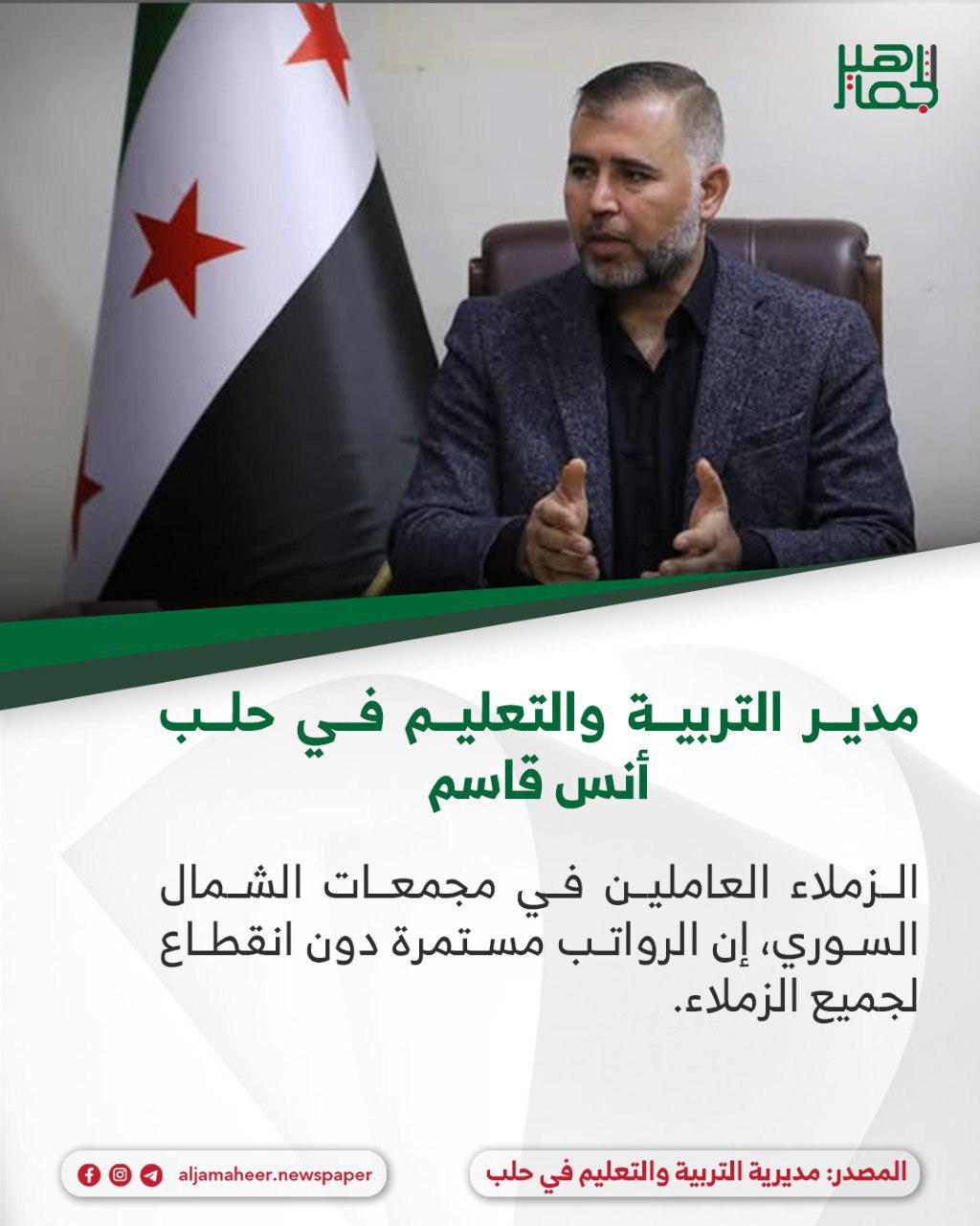 📌 نهيب بالزملاء العاملين عدم الإنجرار خلف الشائعات وأن يتابعوا المعرفات الرسمية لوزارة التربية ومديرية التربية والتعليم في حلب.