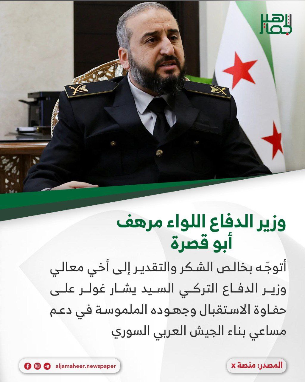 📌أتوجّه بخالص الشكر والتقدير إلى أخي معالي وزير الدفاع التركي السيد يشار غولر على حفاوة الاستقبال وجهوده الملموسة في دعم مساعي بناء الجيش العربي السوري