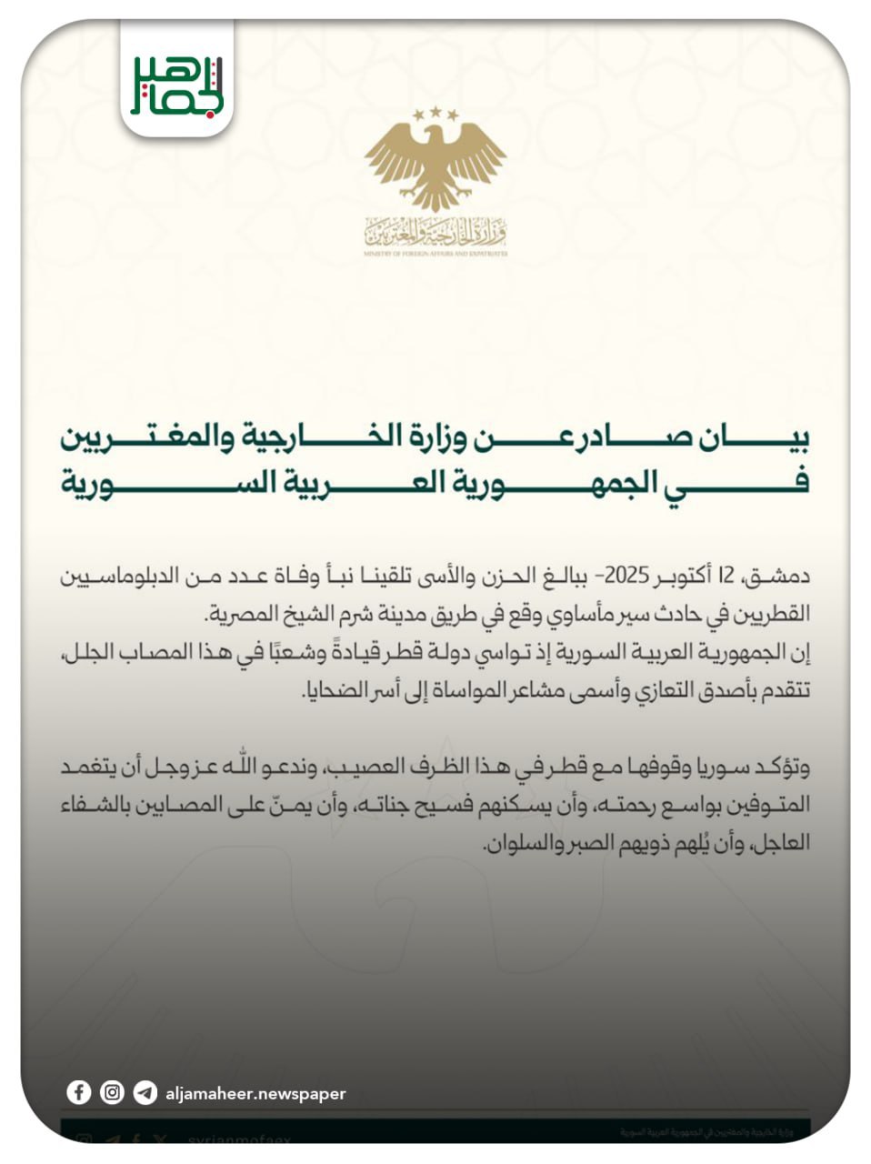 وزارة الخارجية والمغتربين: الجمهورية العربية السورية تواسي دولة قطر قيادةً وشعباً بوفاة عدد من الدبلوماسيين في حادث سير مأساوي في شرم الشيخ المصرية، وتتقدم بأصدق التعازي وأسمى مشاعر المواساة إلى أسر الضحايا. أحدث الأخبار On أكتوبر 12, 2025 Share Share FacebookTwitterGoogle+ReddItWhatsAppPinterestالبريد الإلكتروني