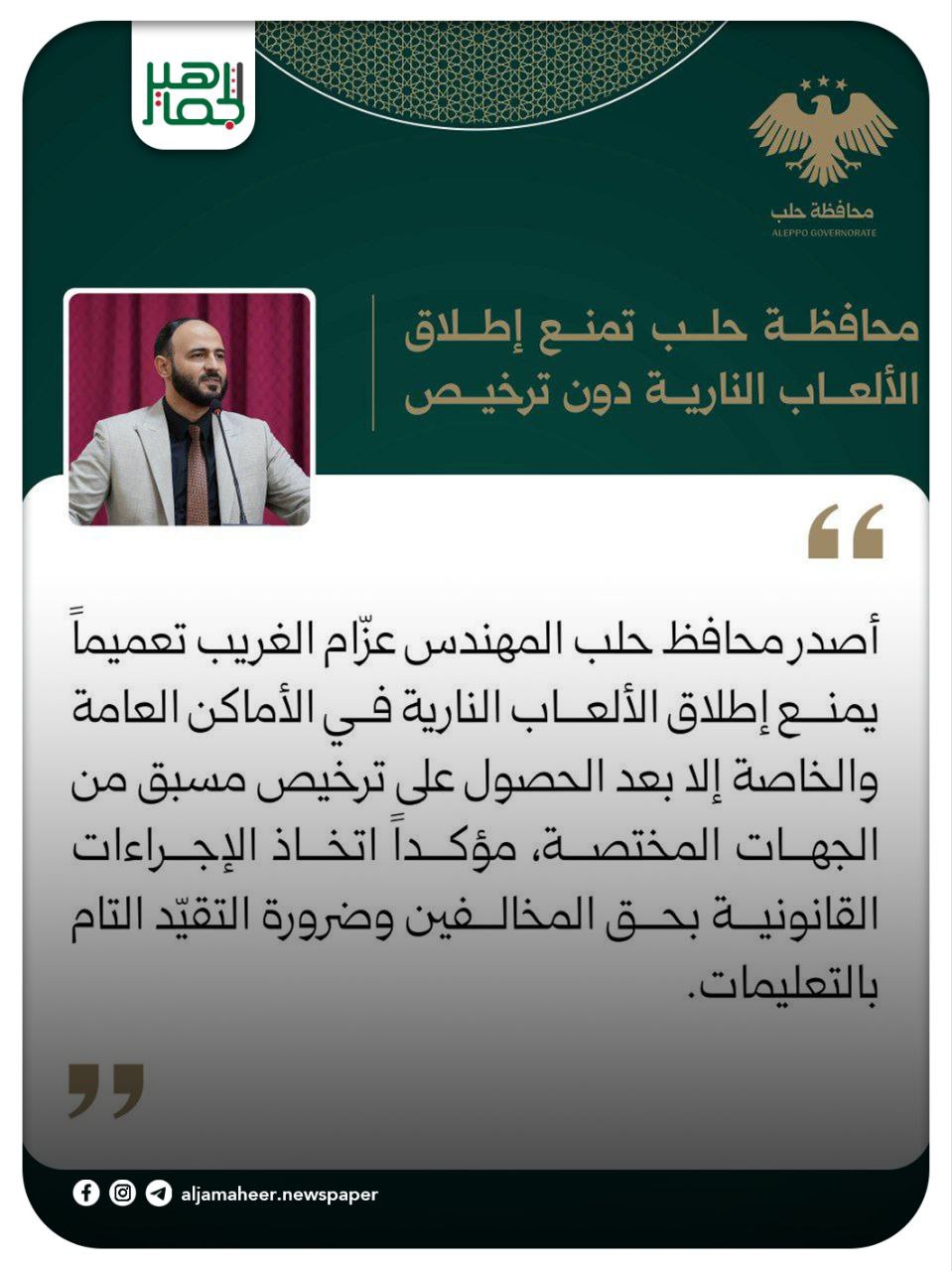 محافظة حلب تمنع إطلاق الألعاب النارية دون ترخيص أحدث الأخبارمحليات On أكتوبر 15, 2025 Share Share FacebookTwitterGoogle+ReddItWhatsAppPinterestالبريد الإلكتروني