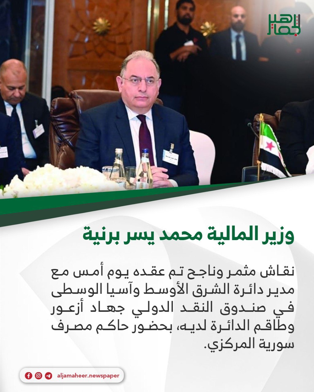 نقاش مثمر وناجح تم عقده يوم أمس مع مدير دائرة الشرق الأوسط وآسيا الوسطى في صندوق النقد الدولي جهاد أزعور وطاقم الدائرة لديه، بحضور حاكم مصرف سورية المركزي.