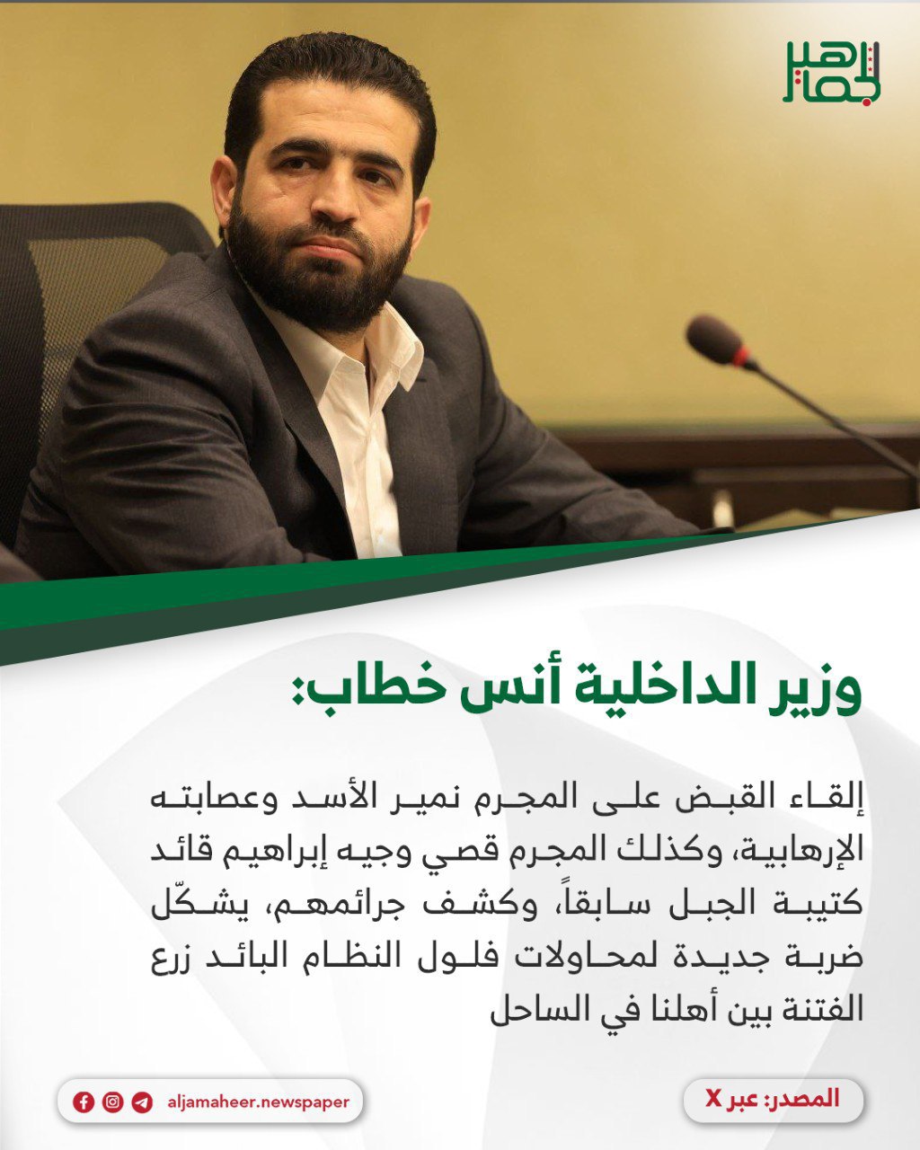 📌 إلقاء القبض على المجـ ـرم نمير الأسد وعصابته الإرهـ ـابية، وكذلك المجـ ـرم قصي وجيه إبراهيم قائد كتيبة الجبل سابقاً، وكشف جرائمـ ـهم، يشكّل ضربة جديدة لمحاولات فلول النظام البائد زرع الفتنة بين أهلنا في الساحل، بدءاً بمنشورات التحريض والترهـ ـيب قبل شهرين، وصولاً إلى محاولات بثّ الرعـ ـب عبر السـ ـلاح لزعزعة أمن المنطقة واستقرارها.