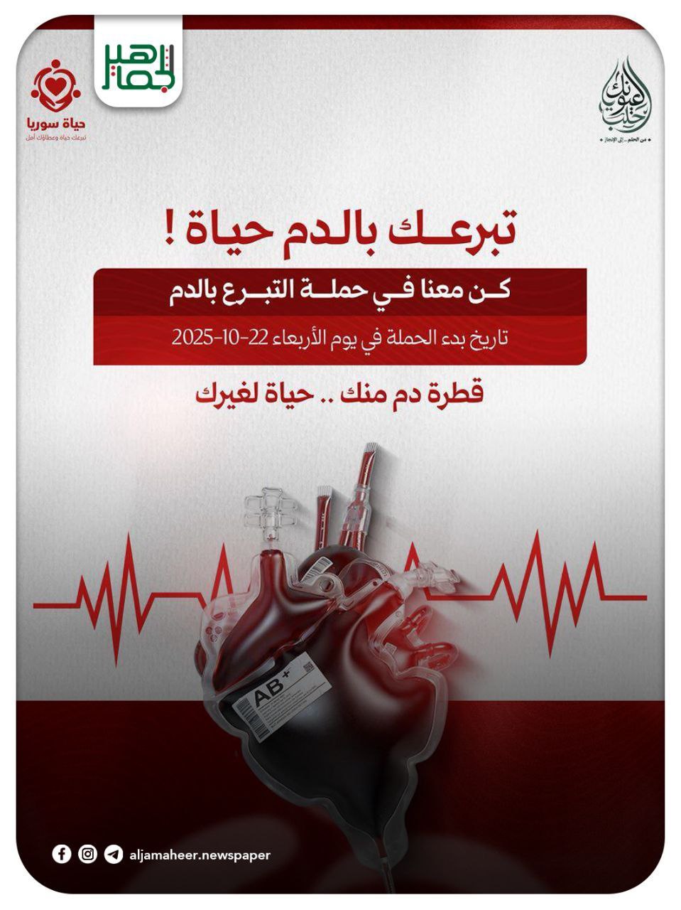 📌انطلقت اليوم الأربعاء حملة التبرع بالدم “حياة سوريا” لدعم بنوك الدم وتعزيز روح التكافل والعطاء الإنساني، بتوجيهات محافظ حلب عزّام الغريب