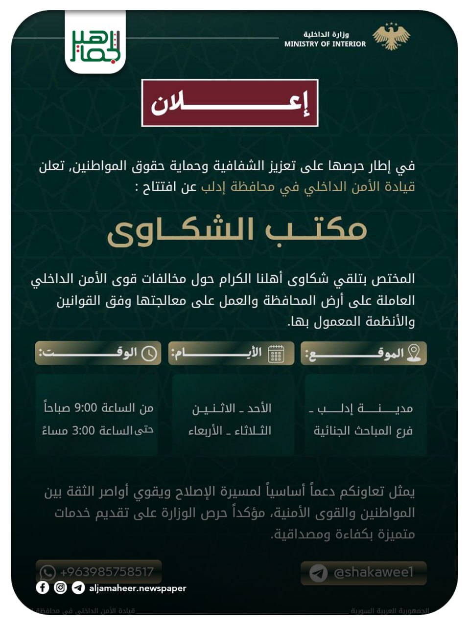 أعلنت قيادة الأمن الداخلي في محافظة إدلب عن انطلاق ديوان الشكاوى المخصص لتلقي شكاوى المواطنين المتعلقة بمخالفات عناصر قوى الأمن الداخلي ضمن المحافظة، والعمل على معالجتها وفق الأطر القانونية والأنظمة المعمول بها، بما يضمن صون الحقوق وحماية المصلحة العامة