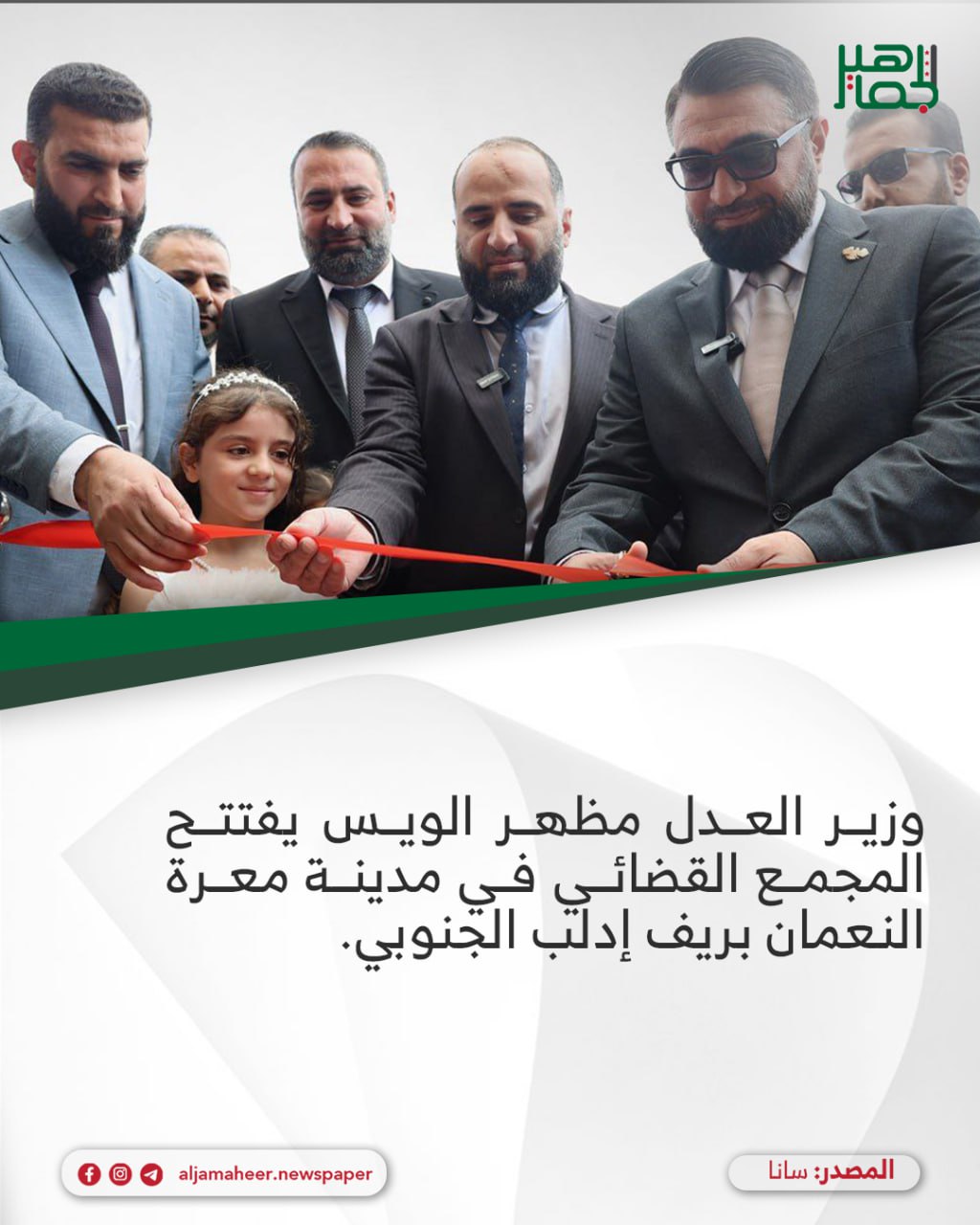 وزير العدل مظهر الويس يفتتح المجمع القضائي في مدينة معرة النعمان بريف إدلب الجنوبي محليات On أكتوبر 26, 2025 Share Share FacebookTwitterGoogle+ReddItWhatsAppPinterestالبريد الإلكتروني