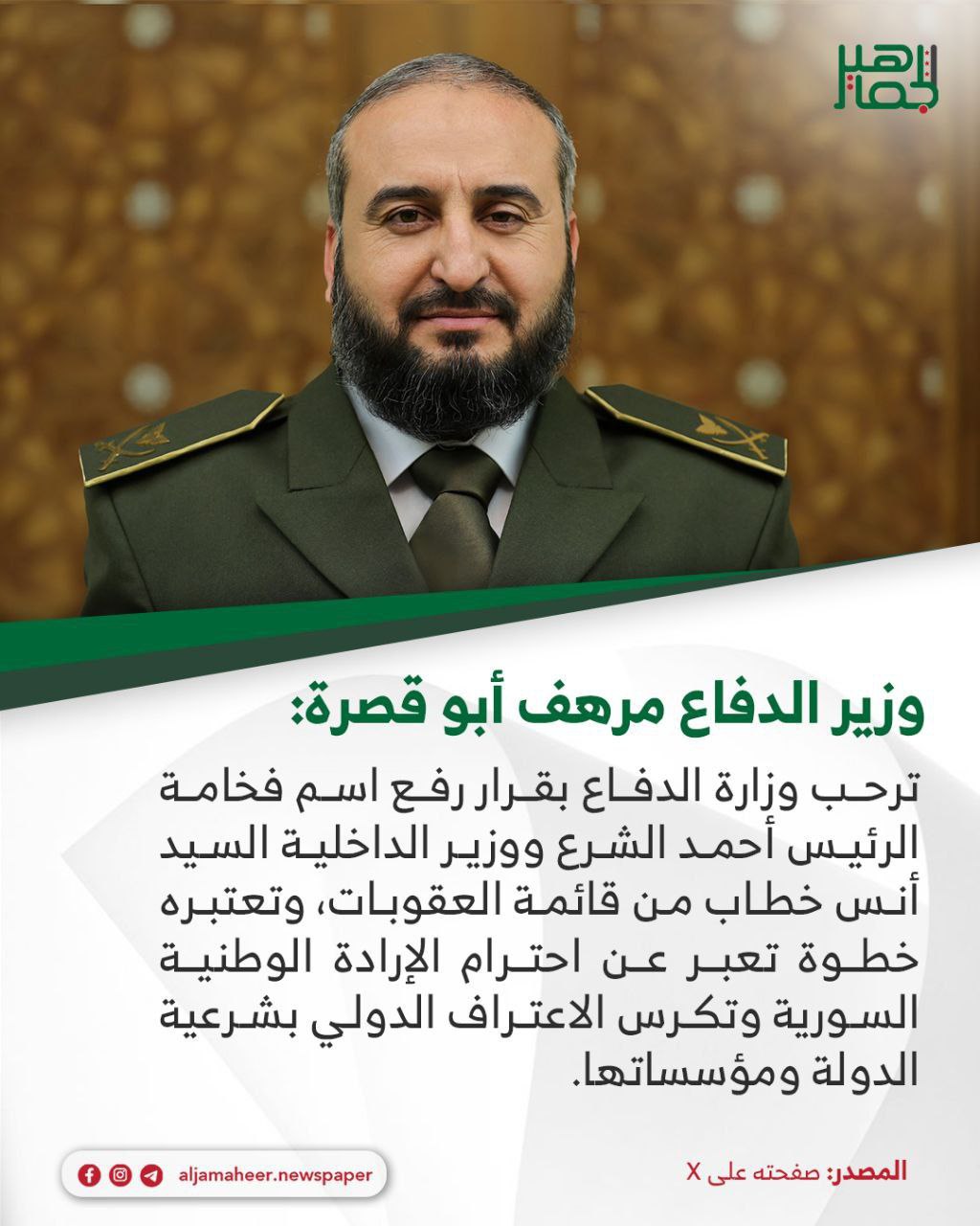 ترحب وزارة الدفاع بقرار رفع اسم فخامة الرئيس أحمد الشرع ووزير الداخلية أنس خطاب من قائمة العقوبات.