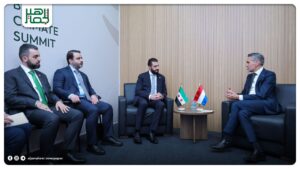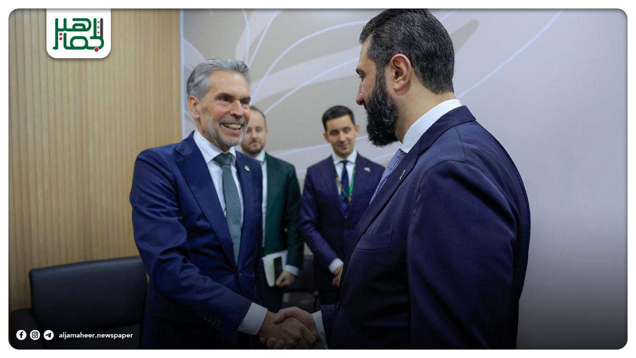 اجتمع الرئيس #أحمد_الشرع مع رئيس وزراء مملكة هولندا السيد ديك شوف، وذلك على هامش أعمال قمة المناخ (COP30) في مدينة بيليم البرازيلية، بحضور وزير الخارجية والمغتربين أسعد الشيباني ووزير الإدارة المحلية والبيئة محمد عنجراني. محليات On نوفمبر 7, 2025 Share #صحيفة_الجماهير Share FacebookTwitterGoogle+ReddItWhatsAppPinterestالبريد الإلكتروني
