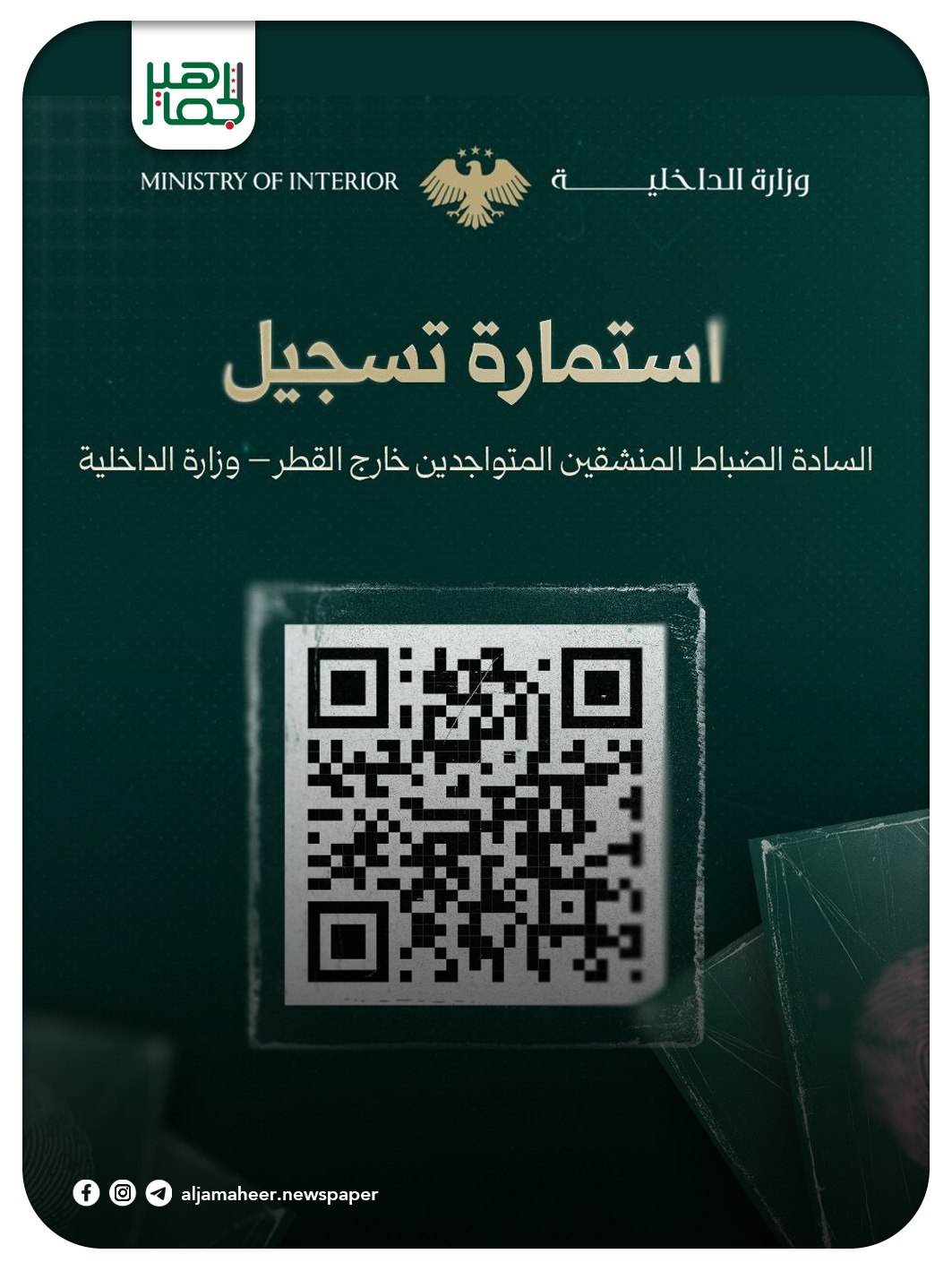 بعد أن أعلن وزير الداخلية، أنس خطاب، عن فتح باب التواصل مع السادة الضباط المنشقين المتواجدين خارج البلاد، تُطلق وزارة الداخلية اليوم استمارة إلكترونية مخصصة لتسجيل بياناتهم، تمهيدًا لتنظيم آلية التواصل ومعالجة أوضاعهم ضمن الأطر الرسمية.