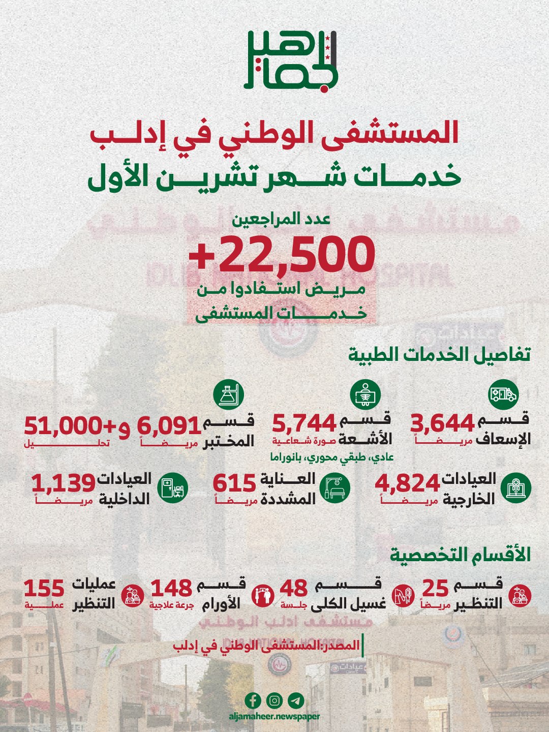 أكثر من 22 ألف و500 مريض استفادوا من خدمات المستشفى.. خدمات المستشفى الوطني في إدلب خلال تشرين الأول الماضي. عين الجماهير On نوفمبر 9, 2025 Share #صحيفة_الجماهير Share FacebookTwitterGoogle+ReddItWhatsAppPinterestالبريد الإلكتروني