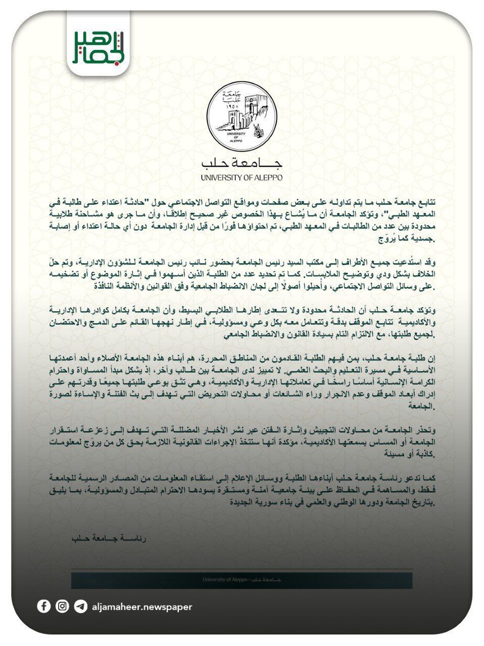 جامعة حلب تنفي ما يتم تداوله على بعض صفحات ومواقع التواصل الاجتماعي حول حادثة اعتداء على طالبة في المعهد الطبي