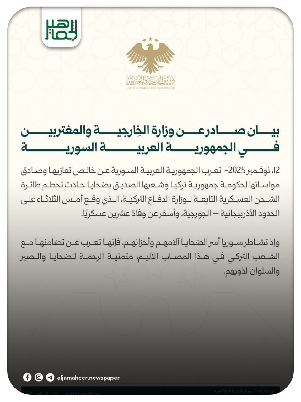 بيان صادر عن وزارة الخارجية والمغتربين في الجمهورية العربية السورية أحدث الأخبار Last updated نوفمبر 12, 2025 Share تعرب الجمهورية العربية السورية عن خالص تعازيها لحكومة جمهورية تركيا وشعبها، في حادث تحطم طائرة الشحن العسكرية التابعة لوزارة الدفاع التركية، الذي وقع أمس الثلاثاء على الحدود الأذريبجانية_الجورجية، وأسفر عن وفاة 20 عسكرياً Share FacebookTwitterGoogle+ReddItWhatsAppPinterestالبريد الإلكتروني