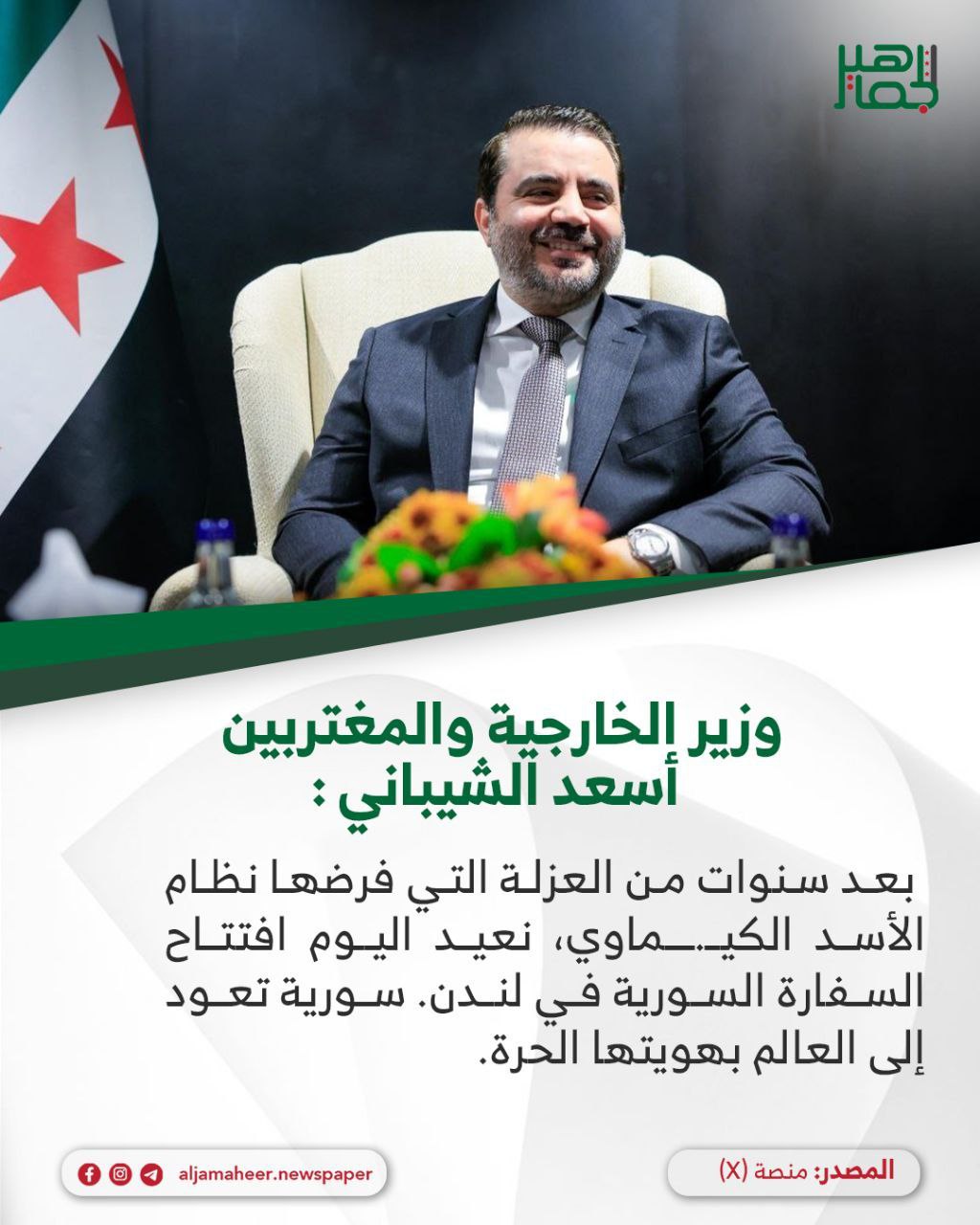 وزير الخارجية والمغتربين أسعد الشيباني عبر منصة “X” أحدث الأخبار On نوفمبر 13, 2025 Share بعد سنوات من العزلة التي فرضها نظام الأسد الكيــ.ــماوي، نعيد اليوم افتتاح السفارة السورية في لندن، سورية تعود إلى العالم بهويتها الحرة. 🔔 اشترك بقناة التيليجرام: https://t.me/jamaheer Share FacebookTwitterGoogle+ReddItWhatsAppPinterestالبريد الإلكتروني