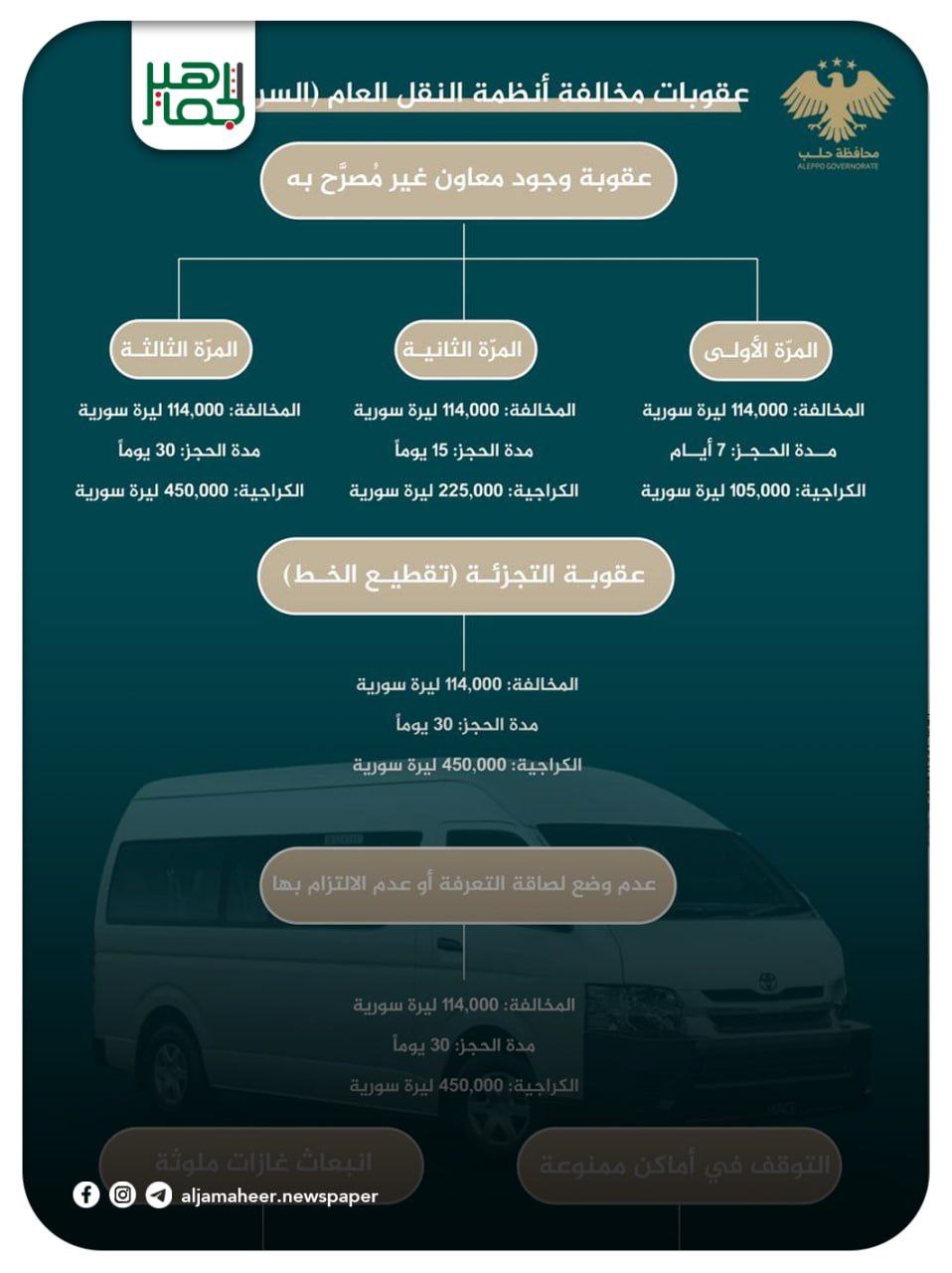 لجنة النقل في محافظة حلب تصدر عقوبات لمخالفي أنظمة النقل العام “السرفيس” تتضمن: عين الجماهير On نوفمبر 14, 2025 Share عقوبة وجود معاون غير مصرح به عقوبة التجزئة ” تقطيع الخط” عدم وضع لصاقة التعرفة أو عدم الالتزام بها التوقف في أماكن ممنوعة انبعاث غازات ملوثة #صحيفة_الجماهير Share FacebookTwitterGoogle+ReddItWhatsAppPinterestالبريد الإلكتروني