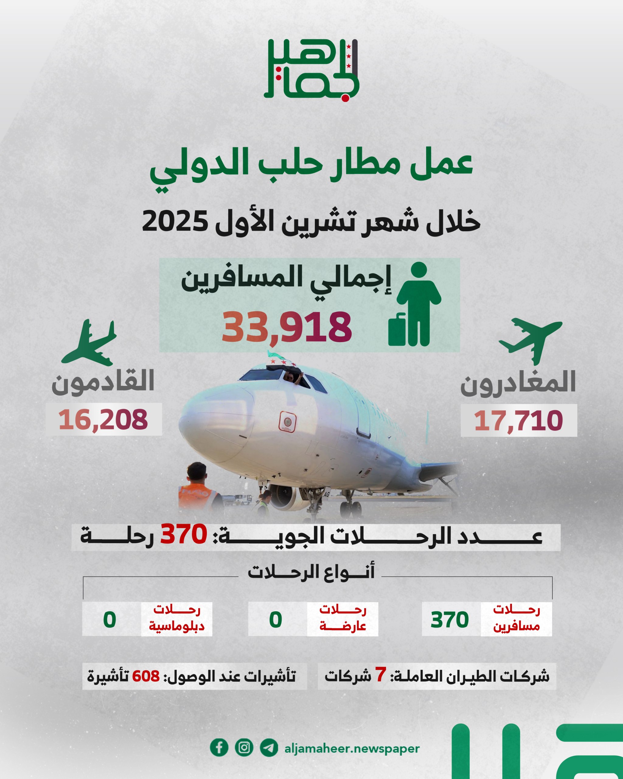 نحو 34 ألف مسافر.. حركة المسافرين في مطار حلب خلال تشرين الأول الماضي محليات On نوفمبر 14, 2025 Share Share FacebookTwitterGoogle+ReddItWhatsAppPinterestالبريد الإلكتروني