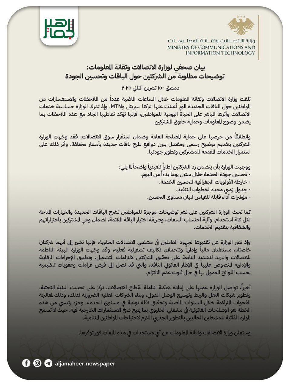 📌وزارة الاتصالات تحث الشركتين على نشر توضيحات عن الباقات والخيارات المتاحة وآلية احتساب الساعات وطريقة اختيار الباقة الملائمة