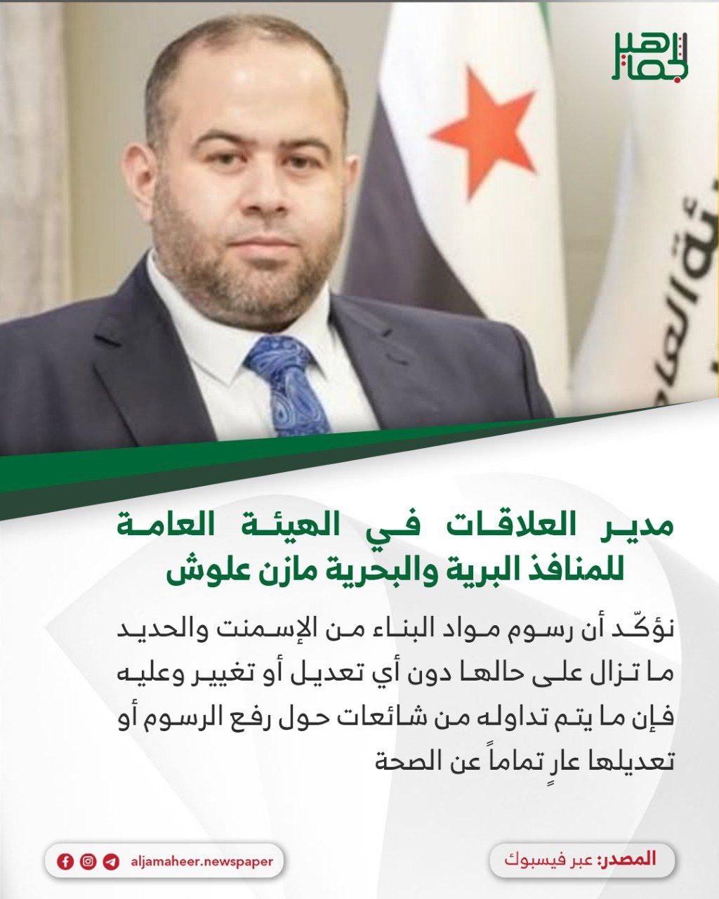 نؤكّد أن رسوم مواد البناء من الإسمنت والحديد ما تزال على حالها دون أي تعديل أو تغيير وعليه فإن ما يتم تداوله من شائعات حول رفع الرسوم أو تعديلها عارٍ تماماً عن الصحة