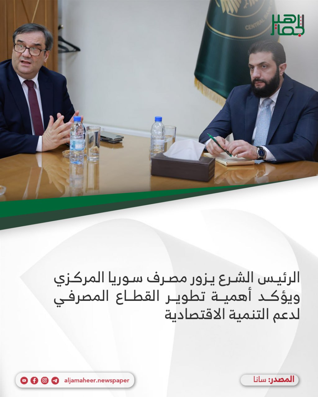 📌وأكد الرئيس الشرع في ختام الزيارة أهمية تطوير القطاع المصرفي وتعزيز دوره بوصفه ركيزة أساسية لدعم مسار التنمية الاقتصادية في البلاد.