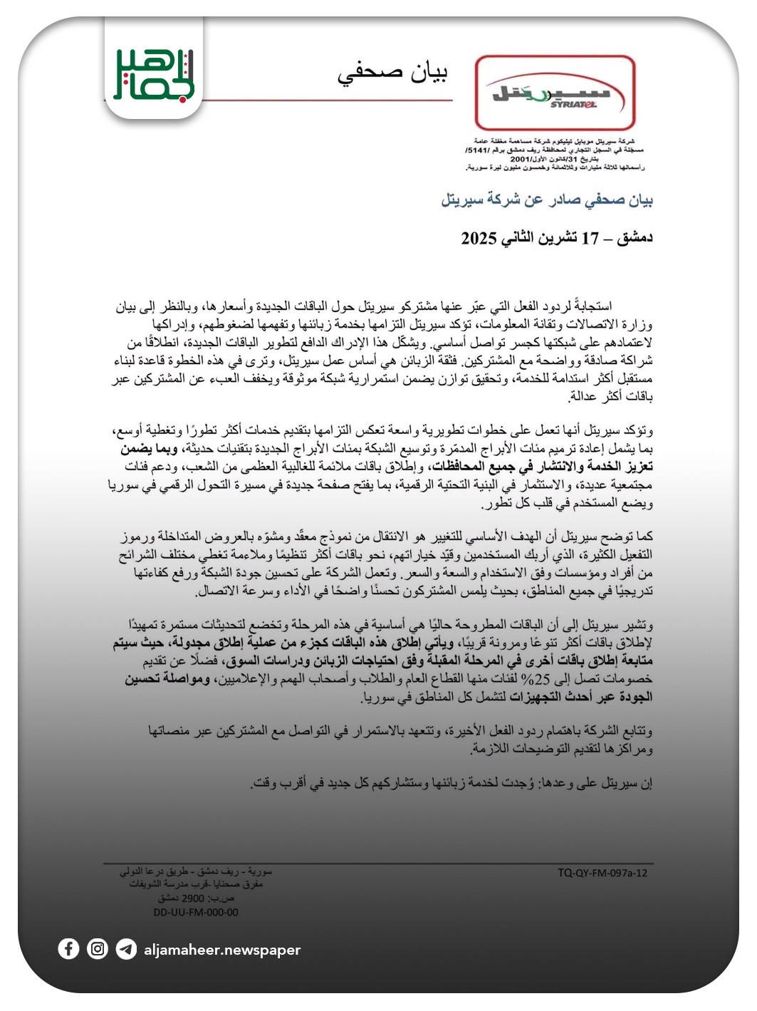 بعد رفع أسعار باقاتها.. شركة سيريتل تصدر بياناً تؤكد فيه التزامها بتحسين جودة الشبكة وتوسيع التغطية لتشمل جميع المحافظات، مع تقديم باقات أخرى لاحقاً تلبي احتياجات الزبائن. أحدث الأخبار On نوفمبر 17, 2025 Share Share FacebookTwitterGoogle+ReddItWhatsAppPinterestالبريد الإلكتروني