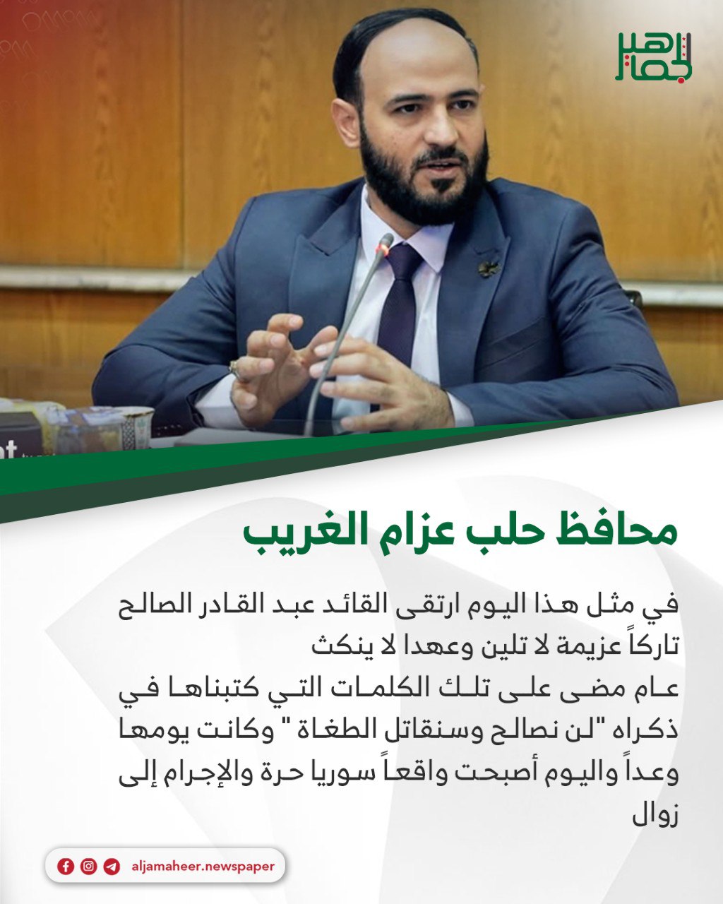 محافظ #حلب المهندس عزام الغريب ينشر رسالة في ذكرى استشهاد القائد عبد القادر الصالح أحدث الأخبارمحليات On نوفمبر 18, 2025 Share Share FacebookTwitterGoogle+ReddItWhatsAppPinterestالبريد الإلكتروني