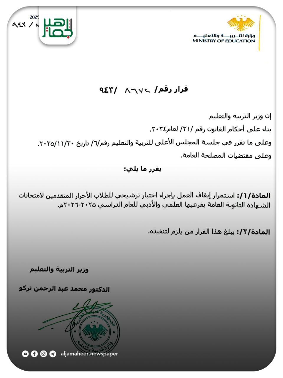 قرار باستمرار إيقاف العمل بإجراء اختبار ترشيحي للطلاب الأحرار المتقدمين لامتحانات الشهادة الثانوية العامة بفرعيها العلمي والأدبي للعام الدراسي 2025_2026م. أحدث الأخبار On نوفمبر 22, 2025 Share Share FacebookTwitterGoogle+ReddItWhatsAppPinterestالبريد الإلكتروني
