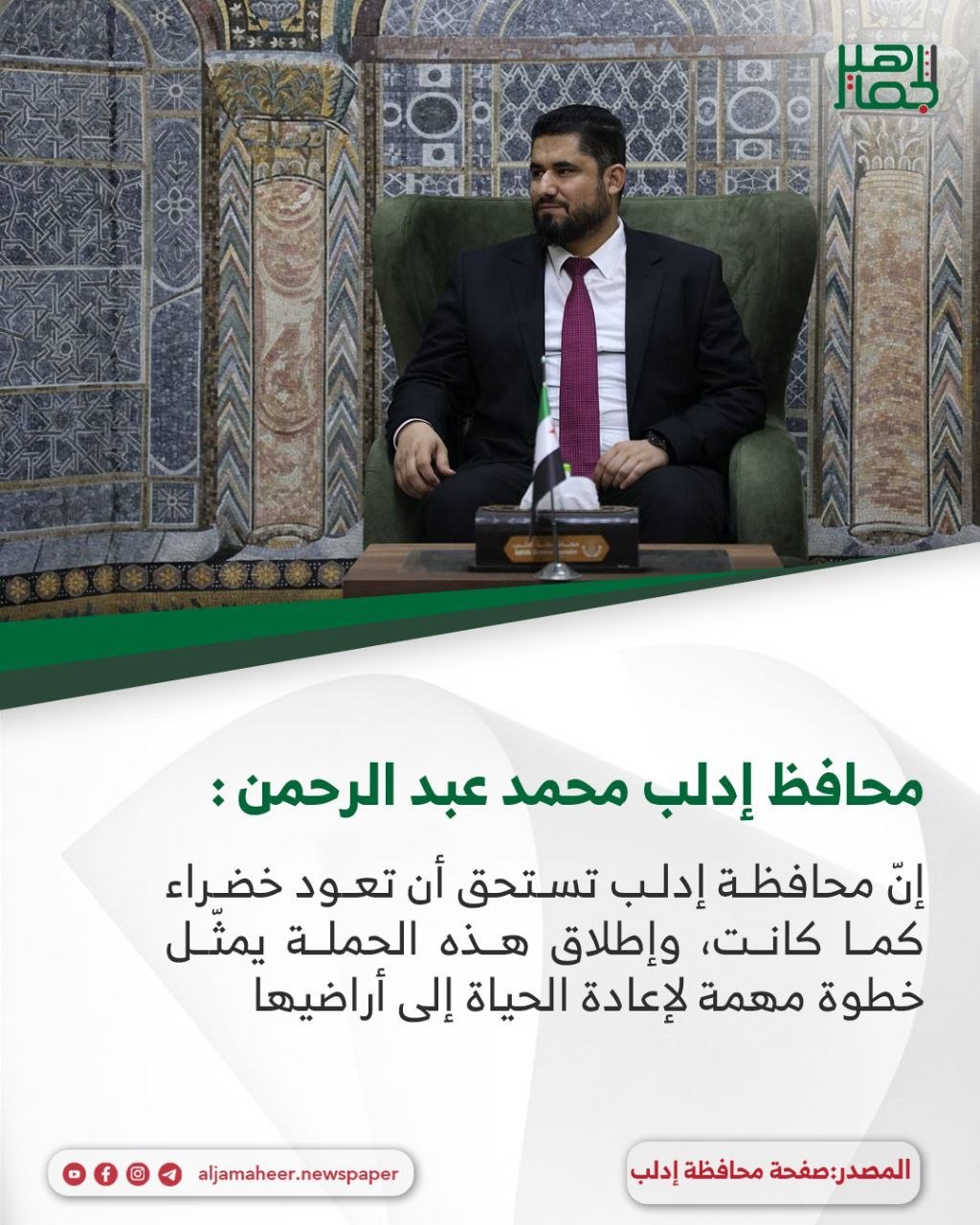 تعلن محافظة إدلب وبالتعاون مع وزارة الزراعة والإصلاح الزراعي، عن إطلاق حملة التشجير تحت شعار:«معاً لنعيد إدلب خضراء»، وذلك يوم غدٍ الأحد الموافق 23 تشرين الثاني 2025.