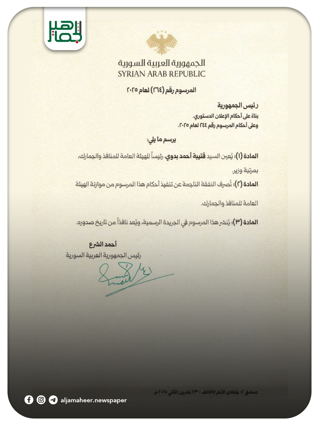 السيد الرئيس #أحمد_الشرع يصدر المرسوم القاضي بتعيين قتيبة أحمد بدوي رئيساً للهيئة العامة للمنافذ والجمارك بمرتبة وزير أحدث الأخبار On نوفمبر 23, 2025 Share Share FacebookTwitterGoogle+ReddItWhatsAppPinterestالبريد الإلكتروني