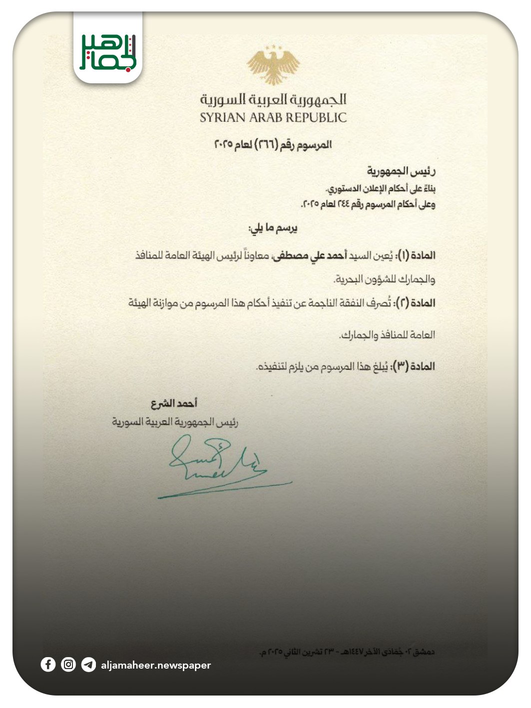 السيد الرئيس #أحمد_الشرع الشرع يُصدر المرسوم القاضي بتعيين أحمد علي مصطفى معاوناً لرئيس الهيئة العامة للمنافذ والجمارك للشؤون البحرية أحدث الأخبار On نوفمبر 23, 2025 Share Share FacebookTwitterGoogle+ReddItWhatsAppPinterestالبريد الإلكتروني