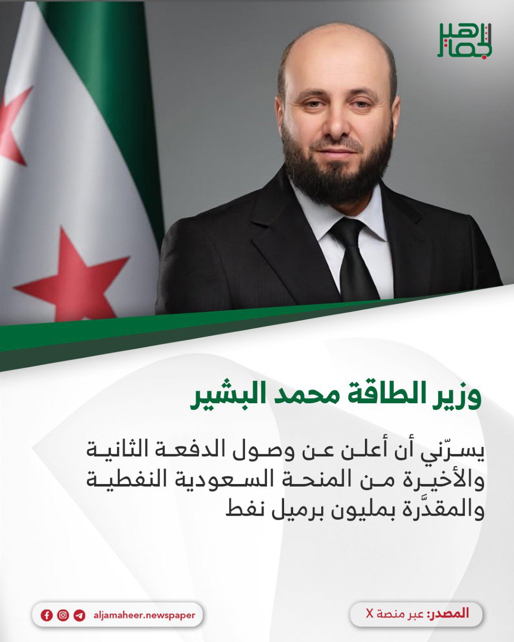 يسرّني أن أعلن عن وصول الدفعة الثانية والأخيرة من المنحة السعودية النفطية والمقدَّرة بمليون برميل نفط ليبلغ إجمالي الشحنة مليوناً وستمائة وخمسين ألف برميل