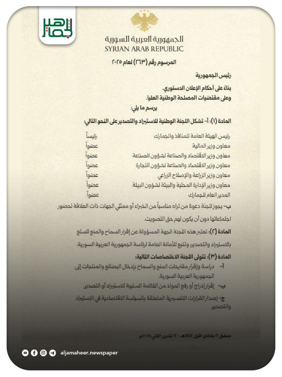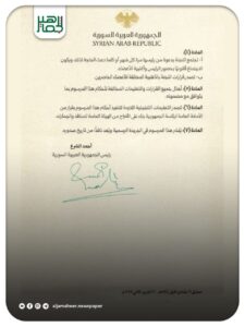 رئيس الجمهورية العربية السورية أحمد الشرع يُصدر مرسوماً يقضي بتشكيل اللجنة الوطنية للاستيراد والتصدير على أن يتولى رئاستها رئيس الهيئة العامة للمنافذ والجمارك. أحدث الأخبار On نوفمبر 24, 2025 Share Share FacebookTwitterGoogle+ReddItWhatsAppPinterestالبريد الإلكتروني