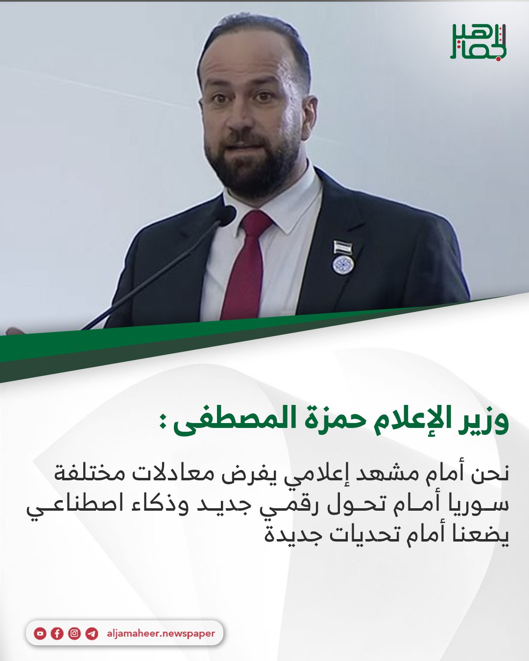 وزير الإعلام حمزة المصطفى خلال تسلمه في مصر رئاسة الدورة الـ55 لمجلس وزراء الإعلام العرب: محليات On نوفمبر 26, 2025 Share نحن أمام مشهد إعلامي يفرض معادلات مختلفة. سوريا أمام تحول رقمي جديد وذكاء اصطناعي يضعنا أمام تحديات جديدة. سوريا تحولت من استهلاك المحتوى إلى صناعته بفضل التحول الرقمي. #صحيفة_الجماهير Share FacebookTwitterGoogle+ReddItWhatsAppPinterestالبريد الإلكتروني