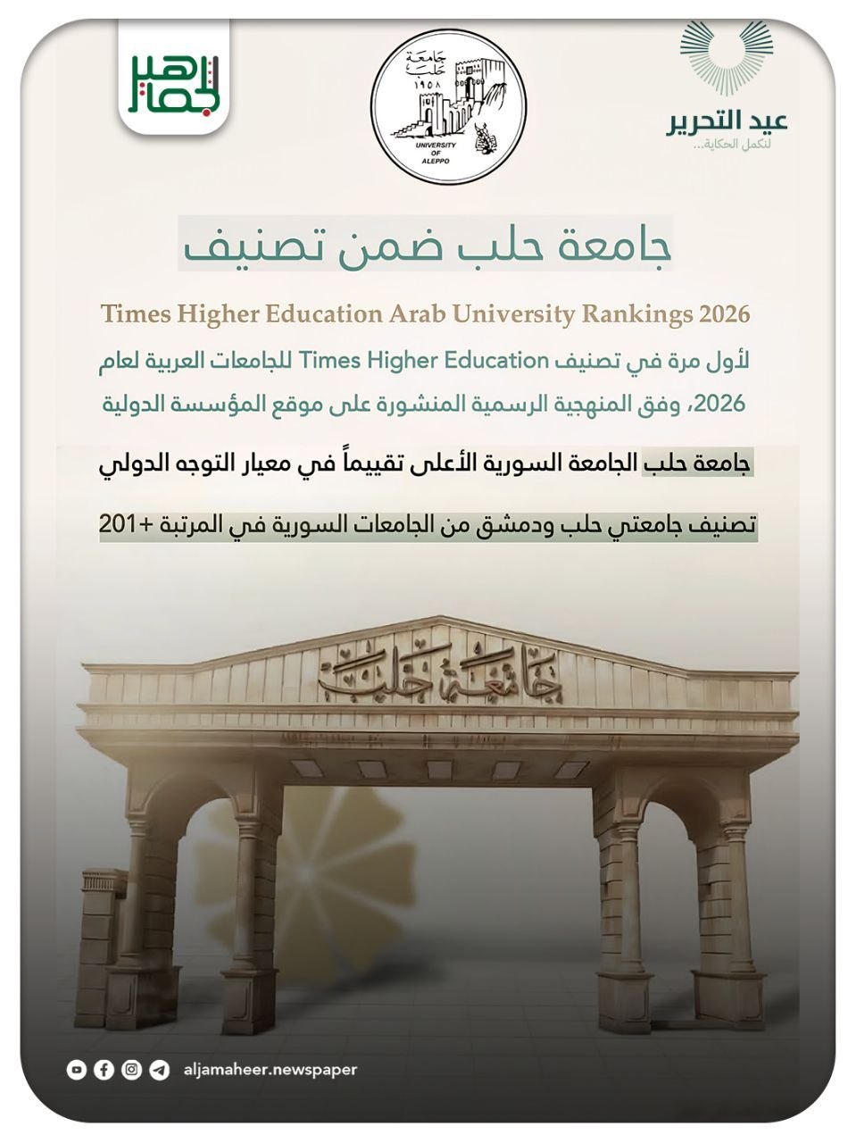 لأول مرة جامعة حلب ضمن تصنيف Times Higher Education للجامعات العربية لعام 2026، تصنف جامعتي حلب ودمشق من الجامعات السورية في المرتبة201+ شباب وجامعات On نوفمبر 28, 2025 Share Share FacebookTwitterGoogle+ReddItWhatsAppPinterestالبريد الإلكتروني