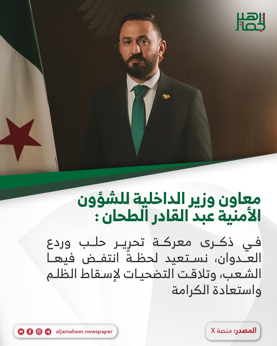 معاون وزير الداخلية للشؤون الأمنية عبد القادر الطحان عبر منصة X: محليات On نوفمبر 29, 2025 Share بعد 13 عاماً من الصبر والمعاناة، آن للتراب أن يزهر حرية. في ذكرى معركة تحرير حلب وردع العدوان، نستعيد لحظةً انتفض فيها الشعب، وتلاقت التضحيات لإسقاط الظلم واستعادة الكرامة، فتحية لحلب… ولمن صمد، وانتصر، وبدأ طريق النهوض والبناء. #صحيفة_الجماهير Share FacebookTwitterGoogle+ReddItWhatsAppPinterestالبريد الإلكتروني