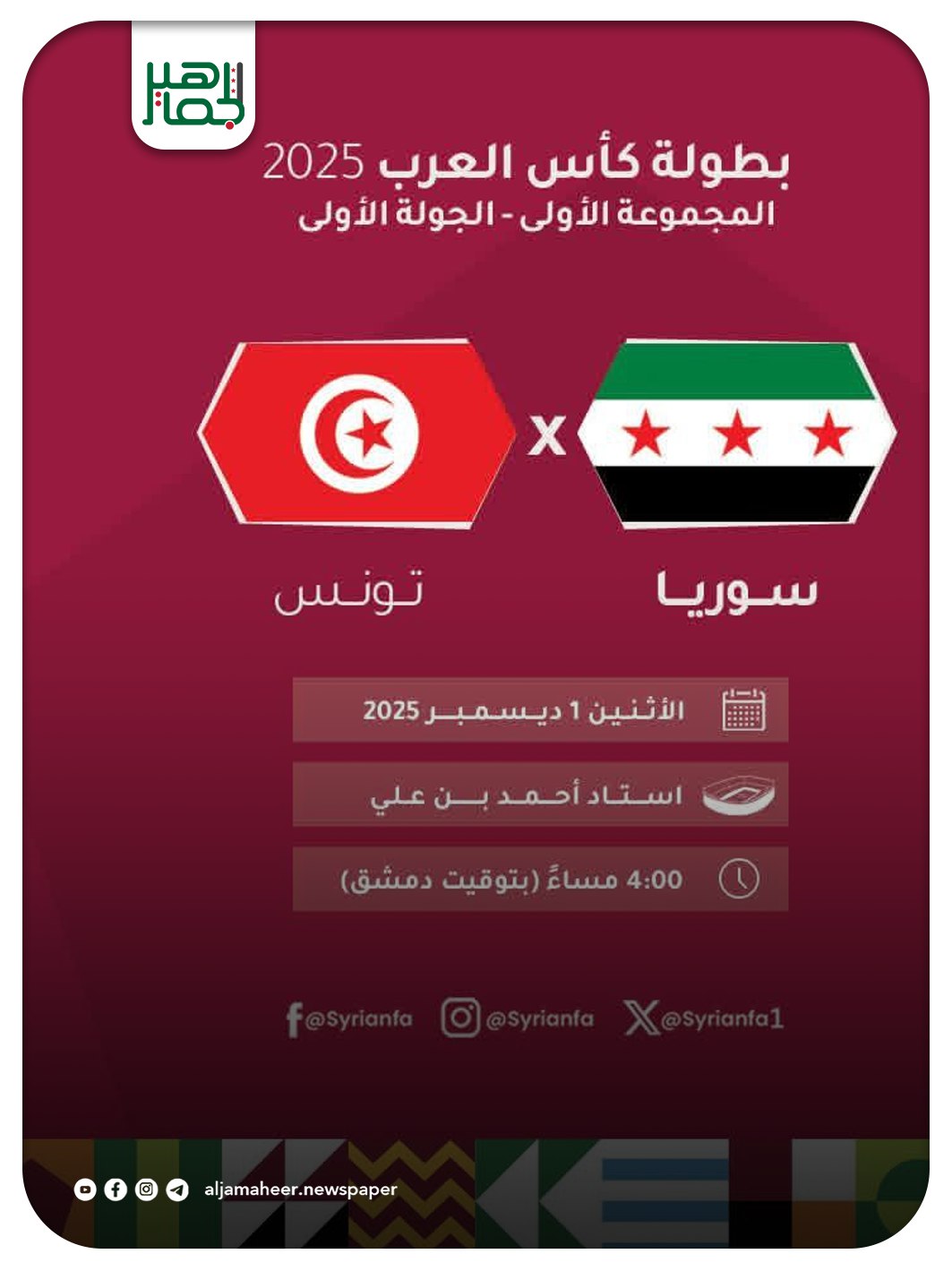 منتخبنا الوطني الأول يواجه نظيره منتخب تونس ضمن مباريات الجولة الأولى من دور المجموعات لبطولة كأس العرب وذلك على استاد احمد بن علي في تمام الرابعة مساءً بتوقيت دمشق. رياضة On ديسمبر 1, 2025 Share #صحيفة_الجماهير Share FacebookTwitterGoogle+ReddItWhatsAppPinterestالبريد الإلكتروني