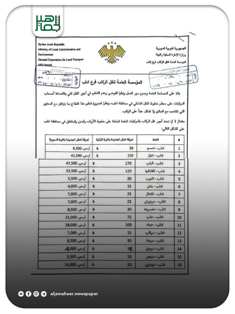 · خط إدلب – حلب (سرفيس): كانت أجرة الراكب حوالي 17000 ليرة سورية، ثم ارتفعت عرفياً وبدون قرار رسمي بمقدار 3000 ليرة سورية، دون تحرك من الجهات المختصة، مما يضع الراكب في موقف صعب عند الاعتراض.