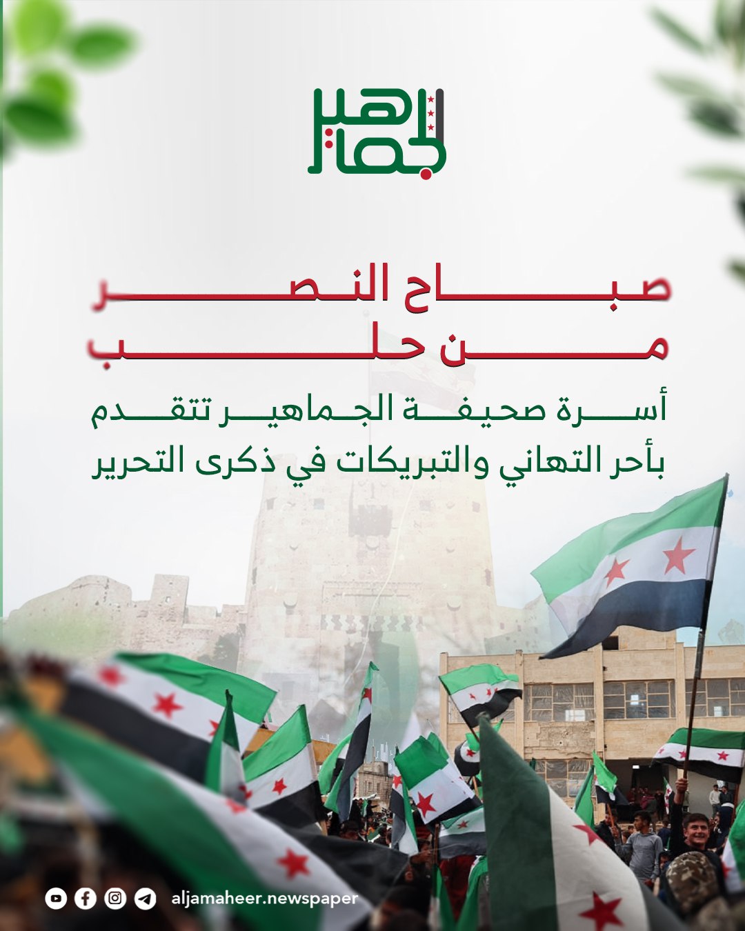 صباح النصر من حلب ..أسرة صحيفة الجماهير تتقدم بأحر التهاني والتبريكات في ذكرى التحرير عين الجماهير On ديسمبر 8, 2025 Share #صحيفة_الجماهير Share FacebookTwitterGoogle+ReddItWhatsAppPinterestالبريد الإلكتروني