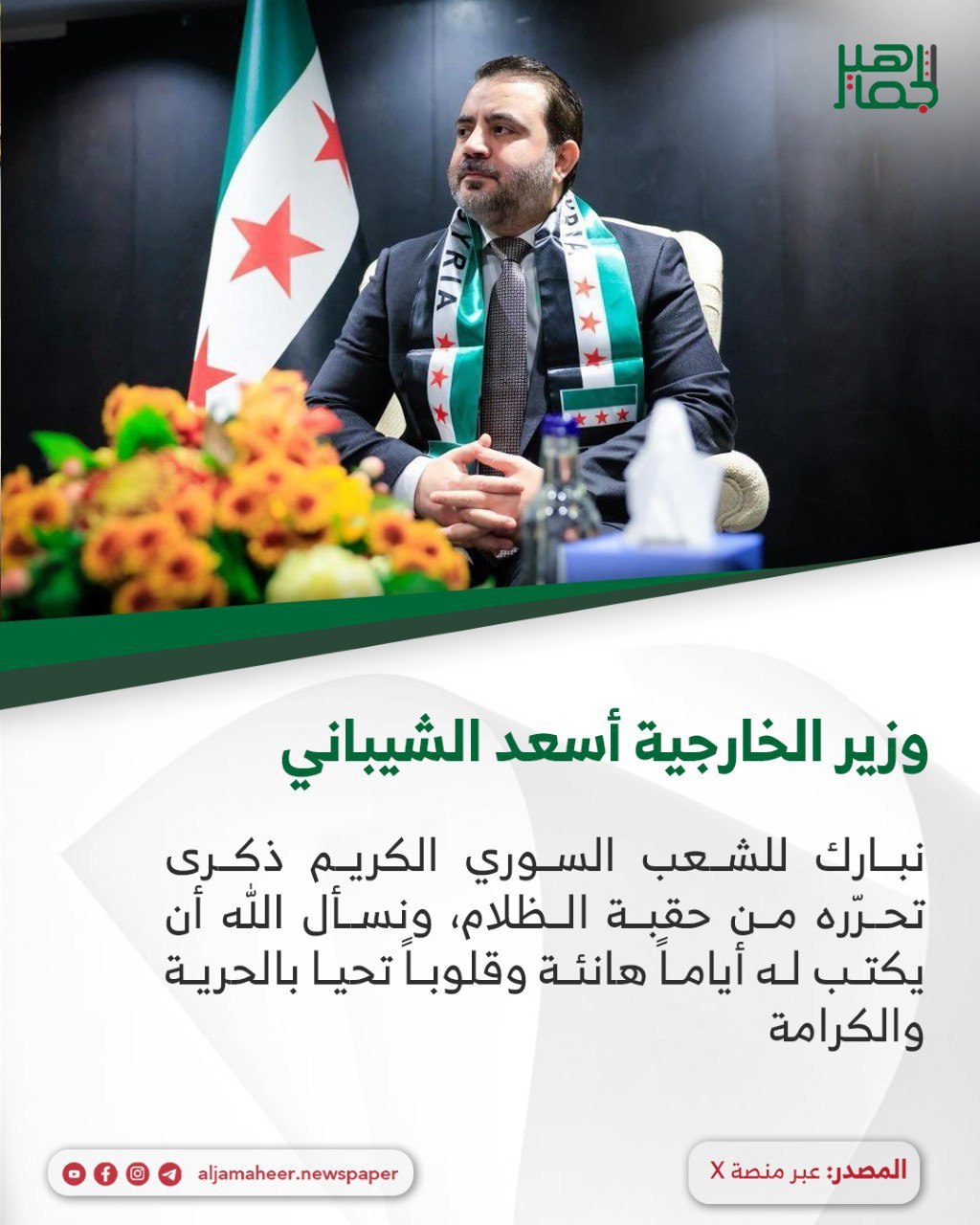 وزير الخارحية أسعد الشيباني عبر منصة (X) محليات On ديسمبر 8, 2025 Share نبارك للشعب السوري الكريم ذكرى تحرّره من حقبة الظلام، ونسأل الله أن يكتب له أياماً هانئة وقلوباً تحيا بالحرية والكرامة. 🔔 اشترك بقناة التيليجرام: https://t.me/jamaheer Share FacebookTwitterGoogle+ReddItWhatsAppPinterestالبريد الإلكتروني