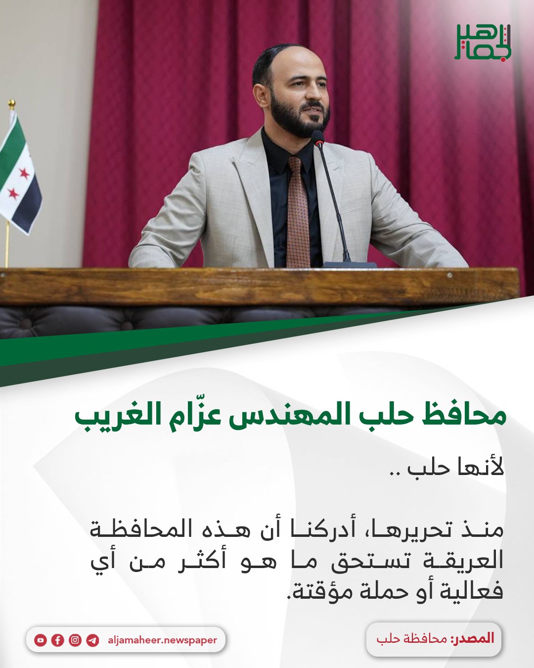 لم و لن نُلزم أحداً بالقيام بواجبه تجاه بلده ولن نسمح بذلك ، لأن ما تريده حلب هو أن تخرج المساهمة – مهما بلغت قيمتها – من القلب، من الانتماء، من الإيمان بأن لحلب مكانة رفيعة وغالية لا تُقدّر بثمن .. و بأنها تستحق أن ننفق عليها مما نحبّ لكي نحظى ببرّها.
