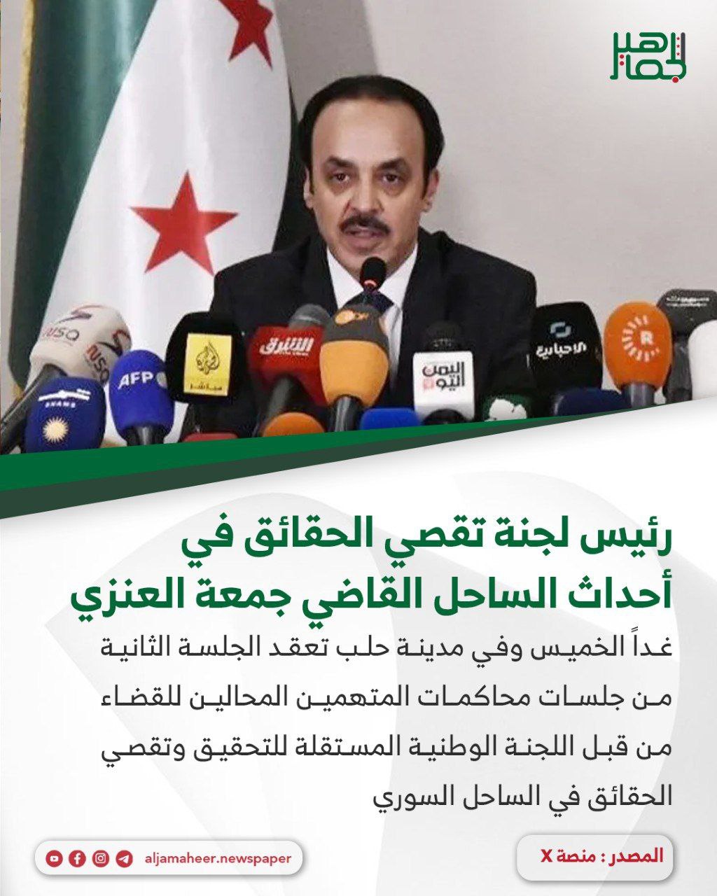 غداً الخميس وفي مدينة حلب تعقد الجلسة الثانية من جلسات محاكمات المتهمين المحالين للقضاء من قبل اللجنة الوطنية المستقلة للتحقيق وتقصي الحقائق في الساحل السوري التي وقعت في 6 آذار الفائت
